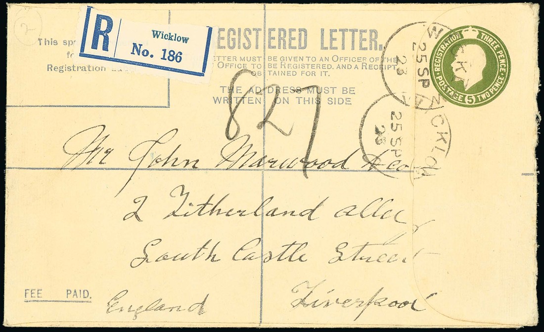 1923 5d. deep olive-green registered postal stationery envelope, size G, control B.R., without check letter, dated 25 Sept. 1923, from Wicklow to Liverpool, fine and rare. Photo