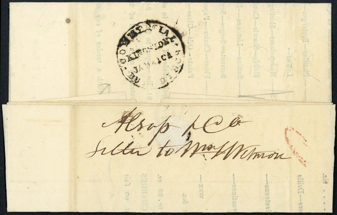 1833 (1 May) entire Wetmore letter from Guayaquil to New York, carried privately to Jamaica and bearing, on the reverse, a good strike of circular "commercial/buildings/kingston/jamaica" 29mm forwarding agent's cachet on the flap with manuscript "Alsop & Co letter to Messrs Wetmore", manuscript "6" in red ink on the address side, no other postal markings. A fine cover bearing this scarce marking and opens well for display