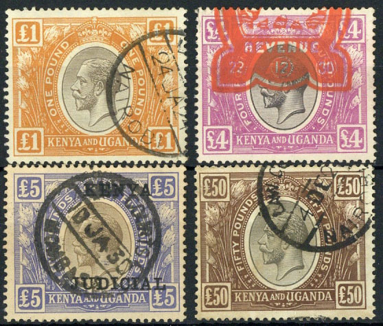 £1, £5 and £50 with Law Courts cancellations, £4 with red embossed revenue cancellation; £5 and £50 a little stained. S.G. 95, 98, 99, 103, £1,065