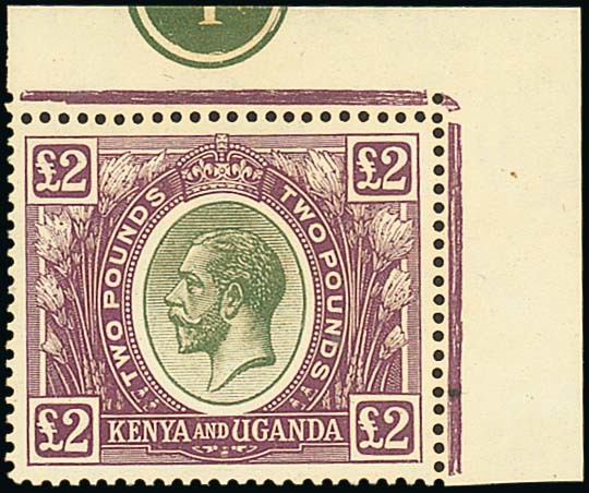 £2 green and purple, an upper right corner margin single showing part of the plate number, lightly mounted in the top margin only; some light gum toning which is usually associated with this issue. A fine stamp of great visual appeal. S.G. 96, £1,000. Photo