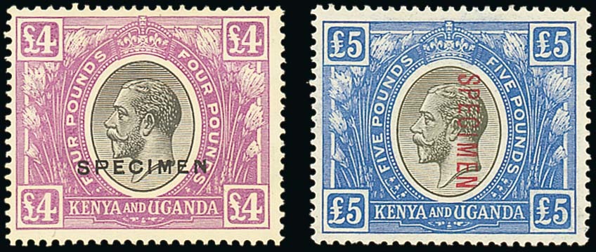 £4 black and magenta and £5 black and blue, both overprinted "specimen", large part original gum; some wrinkles, otherwise fine. S.G. 98s, 99s, £900. Photo
