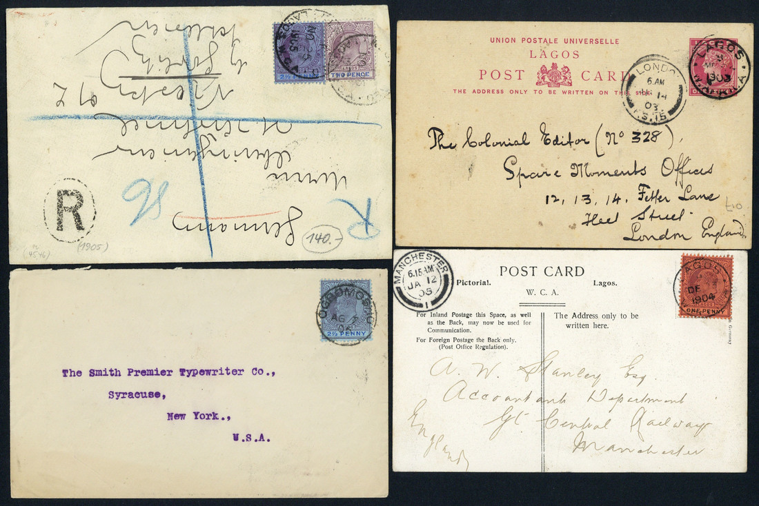 1903 (Mar.) 1d. stationery card to London; 1904 (Dec.) picture postcard to Manchester bearing 1904 1d. and showing, on reverse, "biafra" ship's h.s. in violet; 1905 (25 Nov.) envelope registered to Germany bearing 1904-05 2d. and 2½d. tied by "registered/lagos w.c.a." c.d.s., and 1906 (7 Aug.) envelope to USA bearing 1905 2½d. tied by scarce "ogbomobsho" c.d.s. (Type D2)
