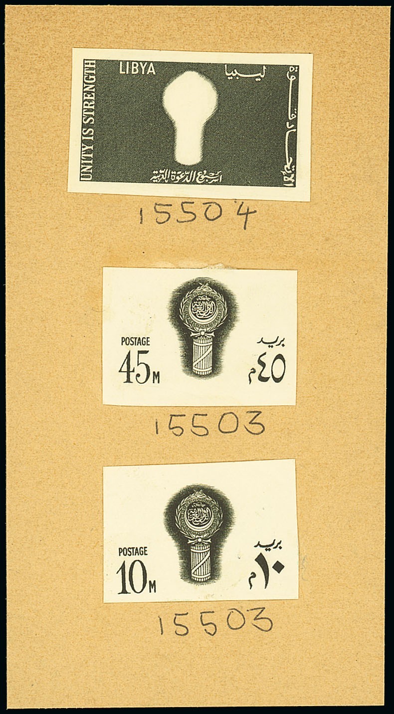 1968 Arab League Week die proof of the frame (numbered 15504) and 10m. and 45m. vignette and value (each numbered 15503), mounted on card (65mm. x 119mm.). Fine