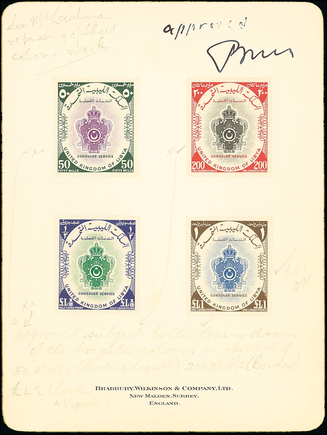 Consular: 1958-64 imperforate proofs (12, five in black and eight in colour) on Bradbury, Wilkinson cards (11), all annotated, most of the black proofs with peripheral tape affixing overlays; fine and rare. Photo