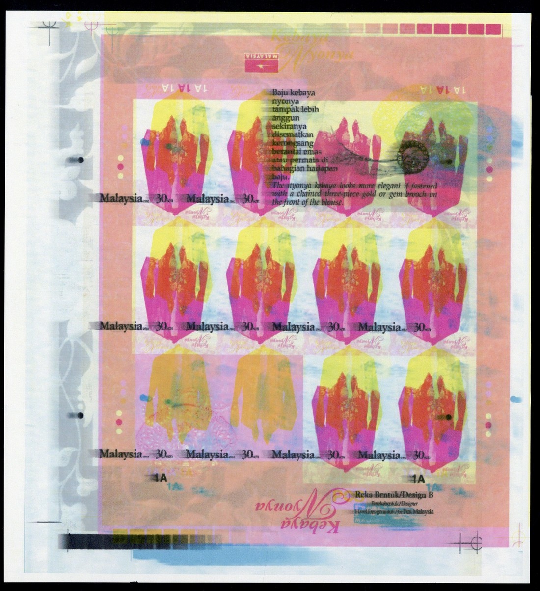 2002 Kebaya Nyonya (Womens Blouse) 30s. imperforate sheetlet of eight with yellow and black printing inverted and misplaced. S.G. 1100