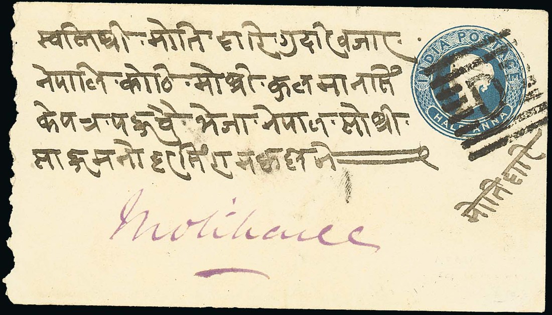 1875 (c.) India ½a. postal stationery envelope to Motiharee, "d" in bars cancellation and with "nepal/oct: 11" d.s. on reverse; fine. Photo