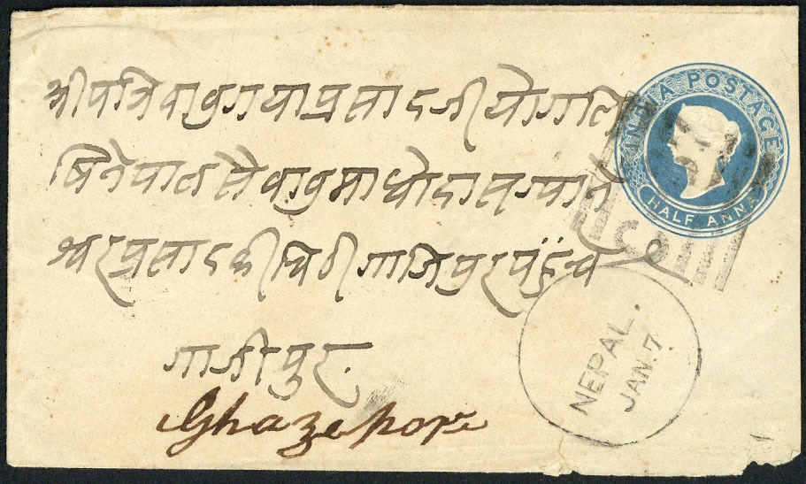 1880 (c.) India ½a. blue postal stationery envelope to Ghazipur, "nepal c-37" duplex cancellation, transit and arrival datestamps on reverse; small portion of the reverse of the envelope missing and other small faults