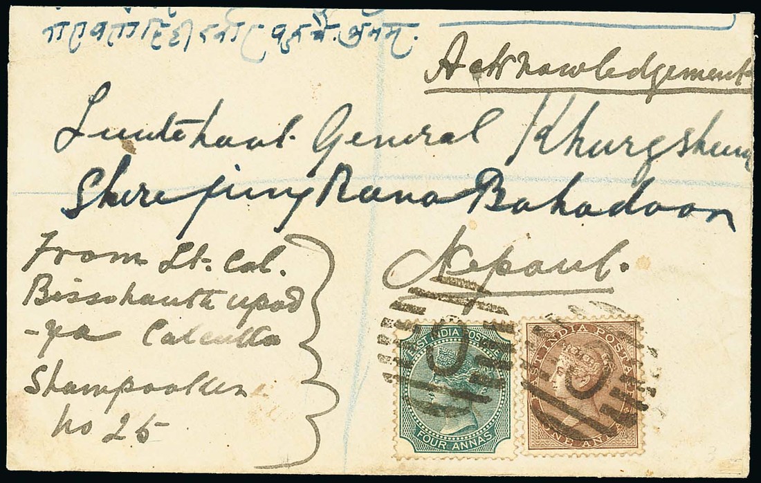 1882 (15 Aug.) envelope registered from Calcutta to Nepal, franked India 1a. and 4a. with "C" in circle of bars cancellations, on reverse boxed registration handstamp and "nepal/aug; 19"; the envelope a little truncated at top, otherwise fine. Photo