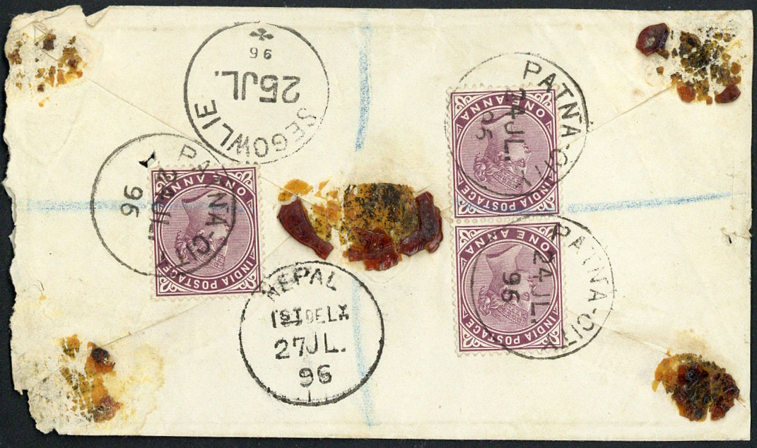 1891 (24 July) envelope registered from Patna to Nepal, franked on reverse with India 1a. (3) and with "nepal/1st.dely" on arrival; a little roughly opened at right and tiny faults