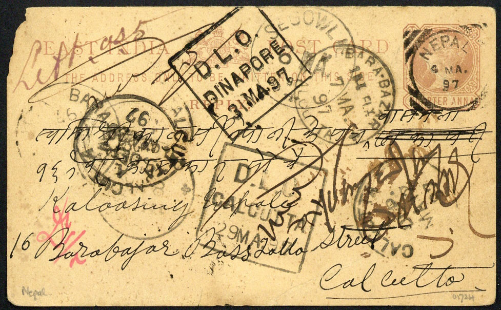 1897 (4 Mar,) India ¼a. postal stationery card to Calcutta, "nepal" squared-circle cancellation, much redirected and with "d.l.o.dinapore" handstamp; small portion missing at upper left, otherwise fine