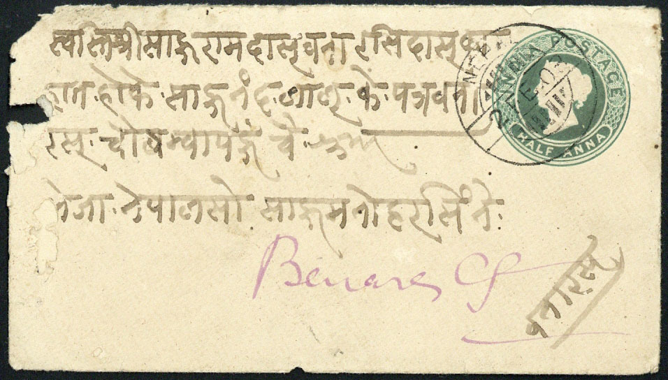 1903 (2 Feb.) India ½a. green postal stationery envelope to Benares City, "nepal" bridge type cancellation, arrival d.s. (5.2.) on reverse; a little roughly opened at left
