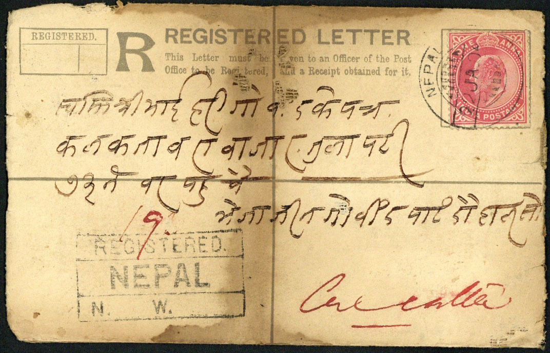 1904 (22 Jan.) India 2a. registered postal envelope to Calcutta, additionally bearing 1a. with "nepal" bridge type cancellation; stained and faults though scarce