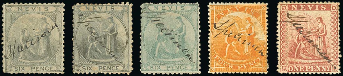 1861 (19 July) recess, greyish paper 6d. grey-lilac (3, one a little discoloured), 1866-76 recess, white paper 4d. orange and 1876-78 litho 1d deep rose-red, each with manuscript "Specimen", the last with small part original gum, the others without gum, the usual perforation and other minor faults, otherwise fine. B.P.A. (1999) or R.P.S. (1974) Certificate for four. S.G. 7, 11. 16. Photo