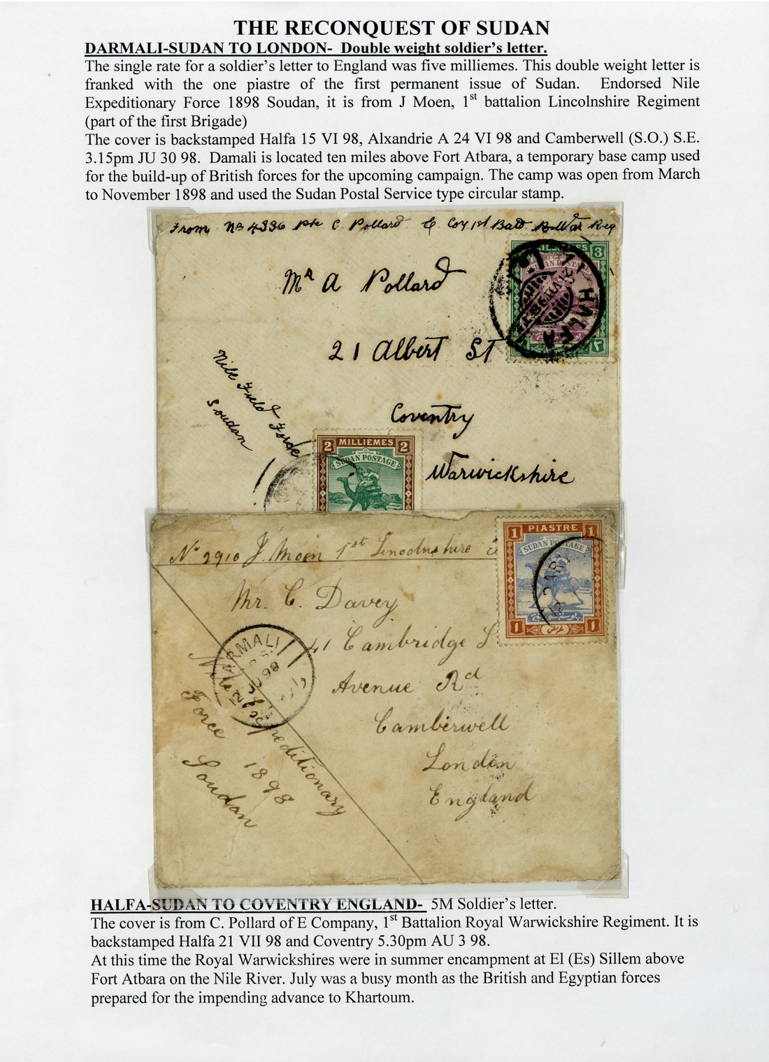 1898 (12 June) soldier's envelope to London, headed "No 2910 J. Moen 1st Lincolnshire Batt", bearing 1p. tied by Darmali c.d.s., and 1898 (21 July) envelope to Coventry, headed "From 4336 Pte C. Pollard E Coy 1st Batt Warwick Reg", bearing 2m. and 3m. tied by Halfa c.d.s.; both envelopes a little soiled
