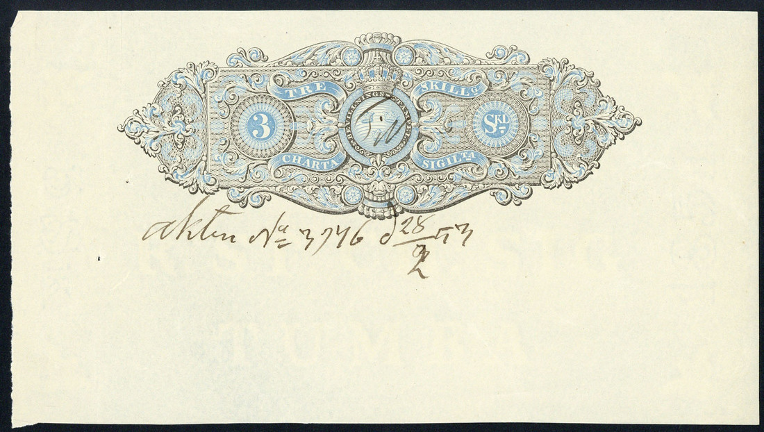 1853 (c.) 3sk. receipt forms in black and light blue (2) printed by Charles Whiting, unusual and highly attractive. Also Danish 6s. receipt form