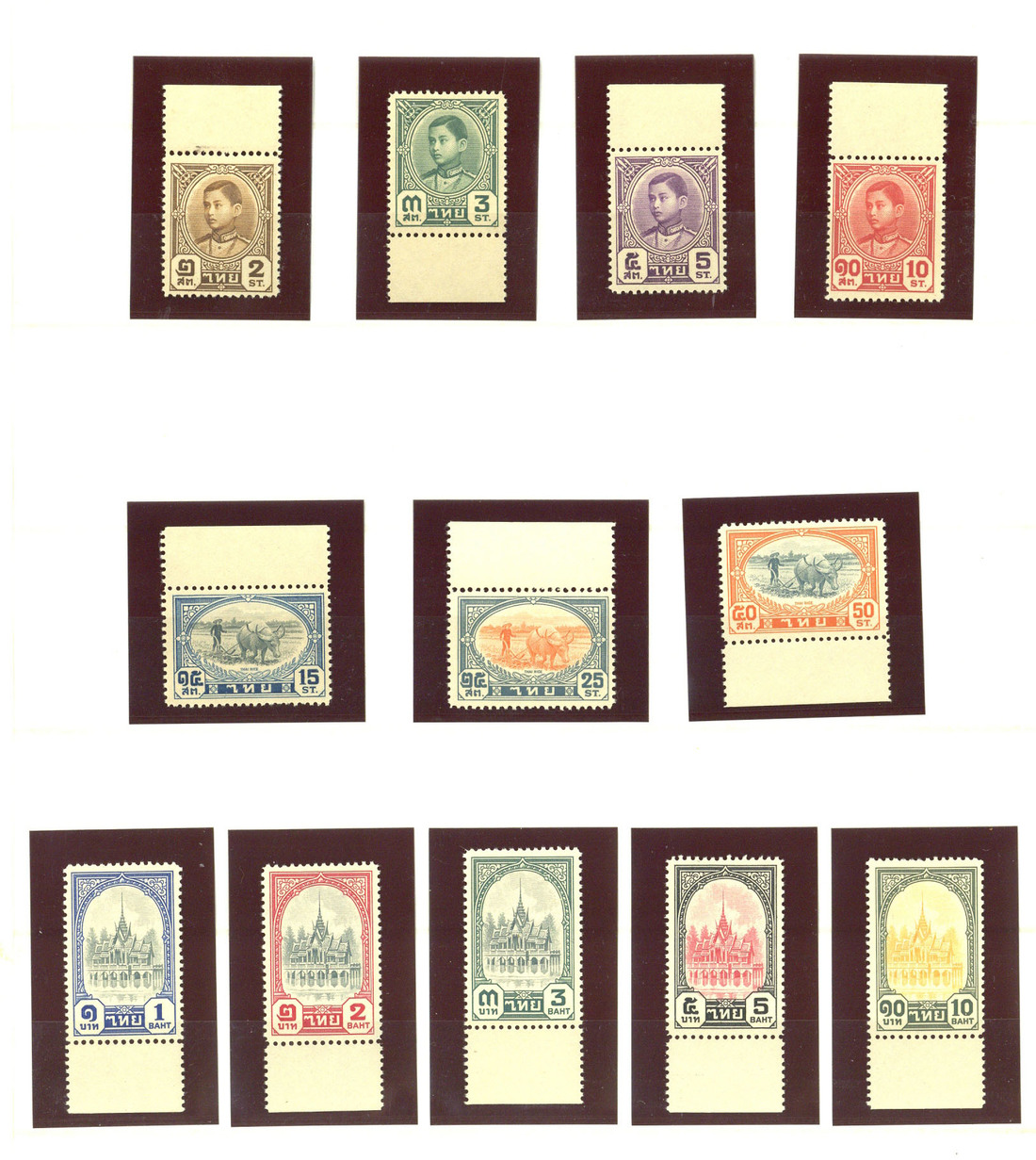 A middle period selection of mint in stockbook with 1899-1904 24a., 1908 mounted King 10t., 20t. and 40t. (light gum ageing), 1932 Chakri Dynasty set, 1940 National Day set, 1941 set to 10b., 1950 Coronation set (2), 1951-60 set to 20b. (2), 1955 King Naresuan set (2), 1956 Don Chedi Pagoda and 1963-71set to 40b. All apparently unmounted mint