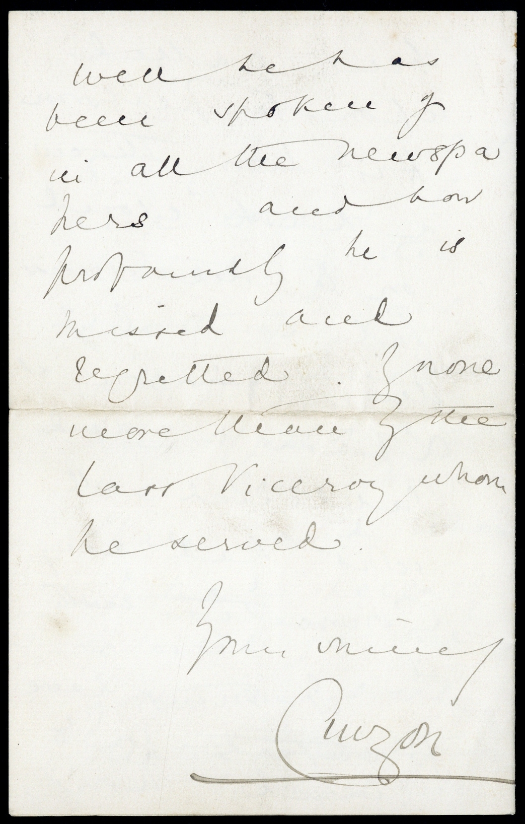 The first, a letter to Bretherton from the "Military Secretary to the Viceroy" to Mardan and re-addressed to Kashmir (stamp torn away), the second from George Curzon, Parliamentary Secretary for foreign affairs to Bretherton at Kashmir, the third to Mrs. Bretherton from George Curzon, regarding the death of her husband, the final letter, again to Mrs. Bretherton, signed "Kitchener" (Adjutant General in India) mentioning "instructions that the medal which your husband would have received for his service in Thibet is to be forwarded to you"