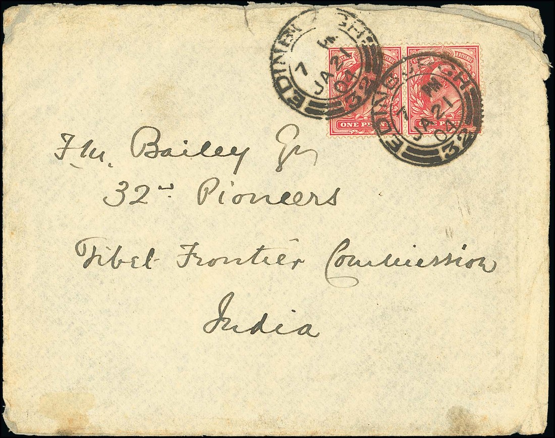 1904 (21 Jan.) envelope (small imperfections) ex the Bailey correspondence from Edinburgh to "32nd, Pioneers Tibet Commission", bearing 1d. (2) and showing, on reverse, a fine strike of the Base Office c.d.s. (8.2); scarce. Photo