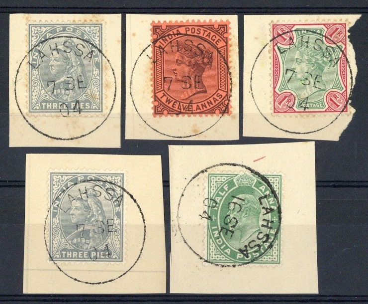 Queen 3p. (2), 12a. and 1r., Edward ½a., each on piece with "lahssa" c.d.s. (Hellrigl B42), fine. The last with Brandon Certificate (1998)