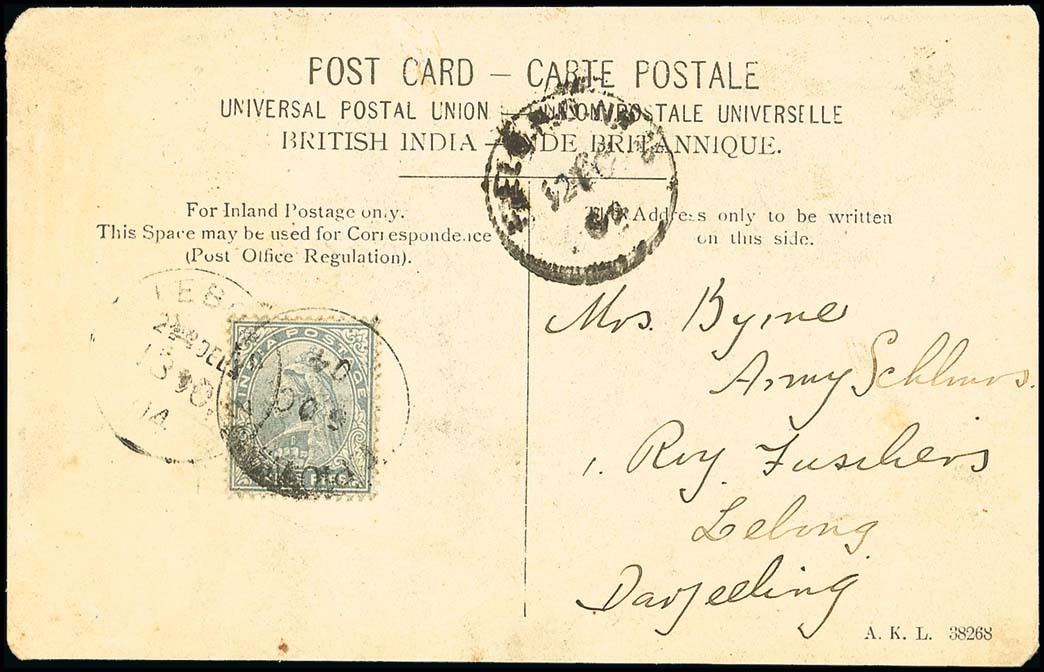 1904 (6 Oct.) picture postcard (Dajeeling - Coolies), bearing 1900 3p. cancelled by "f.p.o. no. 32" (Hellrigl B35) and with a good strike of "f.p.o. no 26" c.d.s. (12.10) and arrival c.d.s. (13.10) alongside; a trifle soiled, scarce. Photo