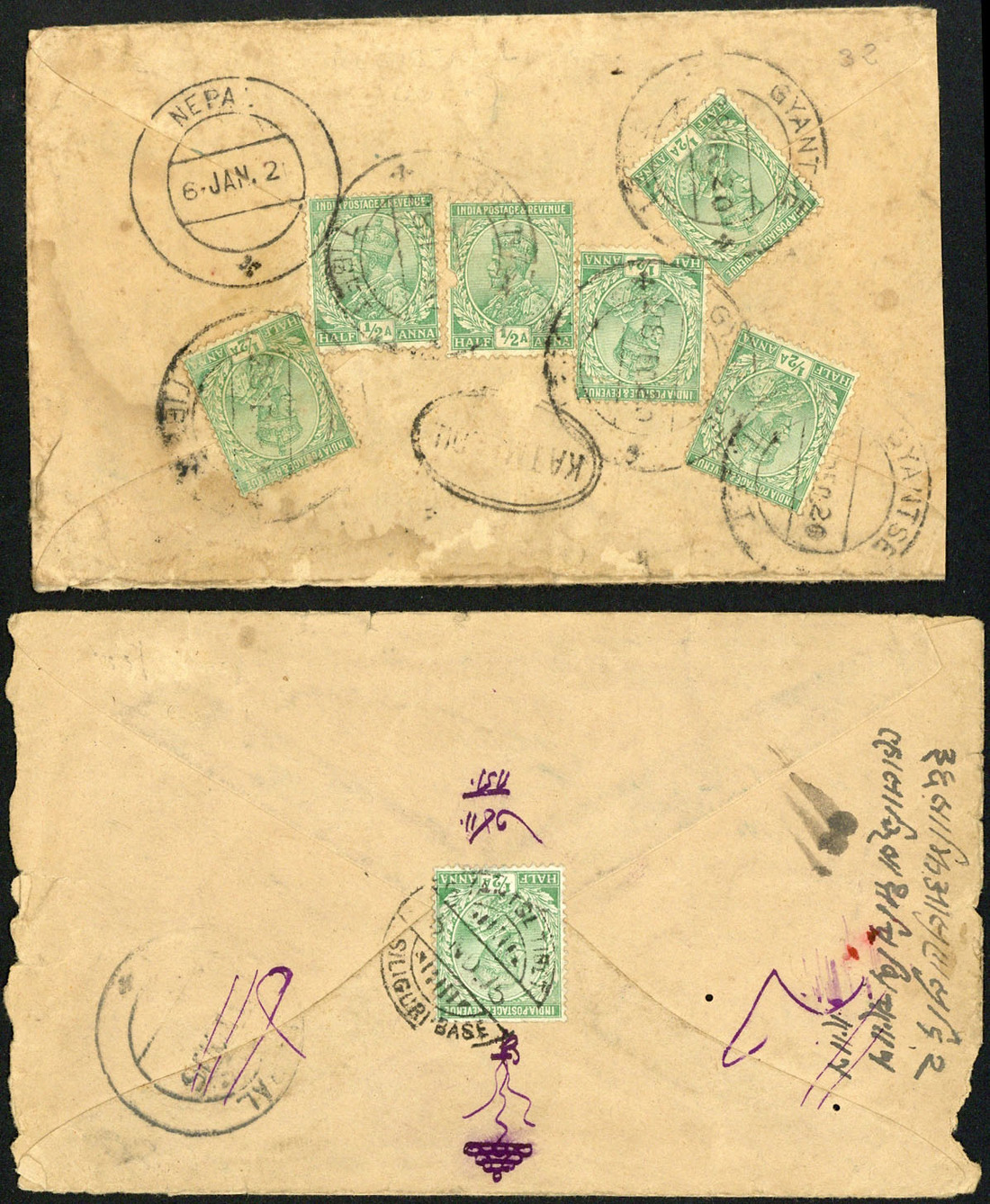 1915 (5 Nov.) envelope to Nepal bearing, on reverse, ½a. with "gyantse-tibet/siliguri base" c.d.s. (Hellrigl B14), also 1920 (28 Dec.) envelope registered to Nepal bearing, on reverse, ½a. (6) with "gyantse/tibet" c.d.s. (Hellrigl B16), oval double-ring "kathmandou" arrival d.s. (6.1.); some faults, good appearance