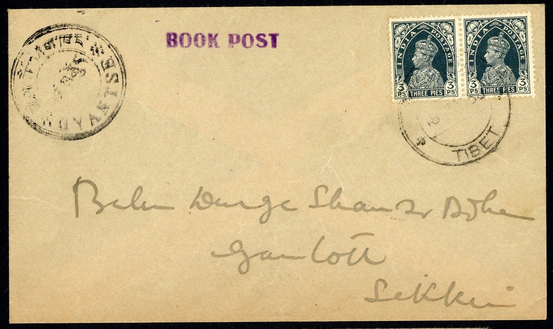 1938 envelope to Sikkim, handstamped "book post" and bearing 3p. pair with "gyantse/tibet" c.d.s. (Hellrigl B48) with bi-lingual Gyantse marking alongside; fine