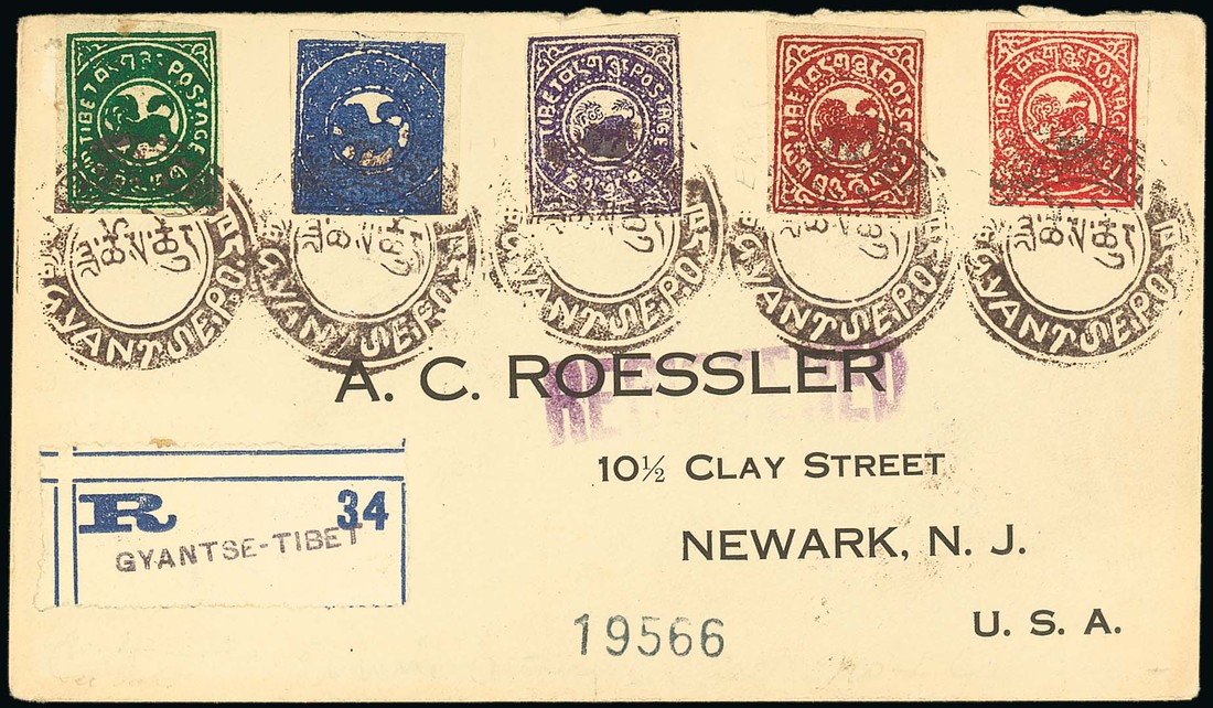 1914 (13 Feb.) "Roessler" envelope registered to New Jersey bearing, on reverse, India ½a. and 4a. with "gyantse-tibet/siliguri base" c.d.s. and, on face, ½t. to 1s. (5 values, 2/3t. with"potsage" error) with Gyantse negative seal cancellations; fine . Photo