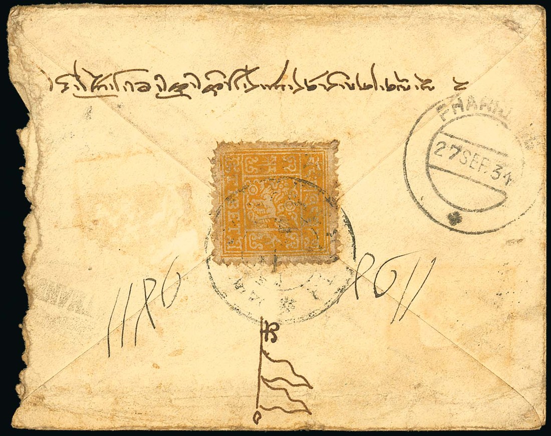 1934 (21 Sept.) India 1a. postal stationery envelope (roughly opened at left and soiled), uprated with 1a., from Nepal to Pharijong, on reverse bearing pin-perf. ½t. orange; rare. Photo