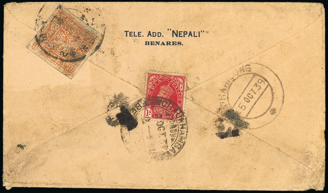 1939 (2 Oct.) envelope from Benares to Pharijong bearing, on reverse, India 1a. and imperf. ½t. orange cancelled on arrival; a little soiled, otherwise fine. Photo