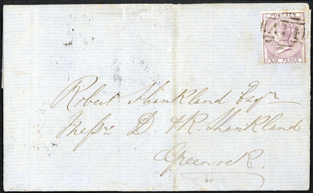 1858 (8 Sept.) entire letter to Scotland, bearing G.B. 6d. lilac cancelled "A14" and with despatch, London (2.10) and small part arrival c.d.s. on reverse, and 1860 (23 Apr.) large piece bearing G.B. 6d. cancelled by superb "A14" and with large part despatch and London Paid (12.5) datestamps; a few small imperfections though not unattractive. S.G. Z3