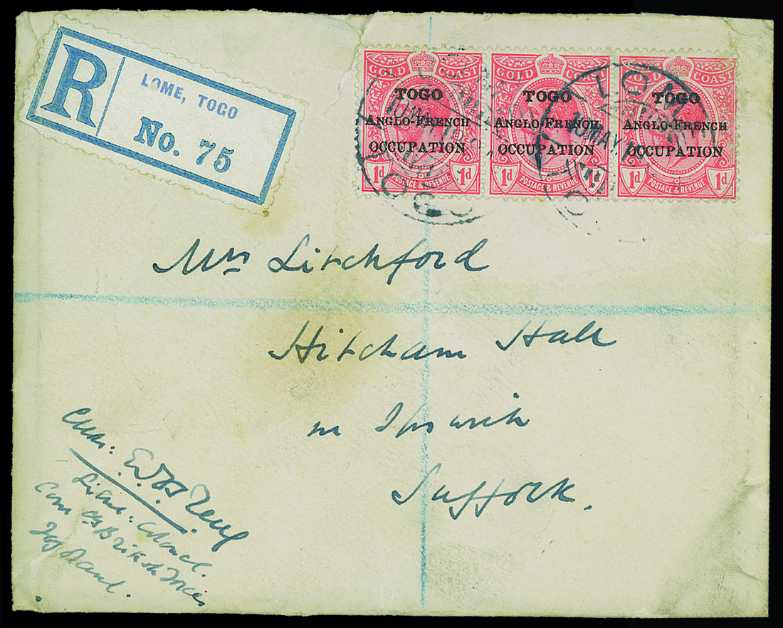 1919 (5 May) envelope (with original contents) registered from Lt. Col. Rew to his sister in Essex, bearing 1916-20 1d. strip of three tied by "lome/togo" c.d.s. and showing registration label alongside; the envelope with some small faults and slightly soiled