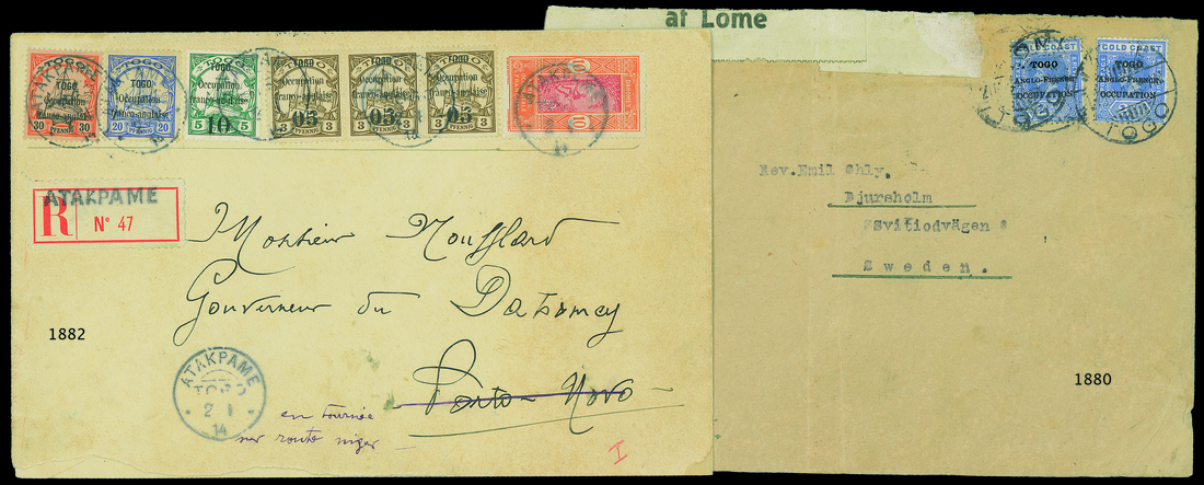 1919 (21 July) envelope (creases) to Sweden, bearing 1916-20 2½d. (2) tied by "lome/togo" c.d.s. and showing, at top, two "Opened by Censor/at Lome" labels (Martin & Walton Type 3), one with part torn away where it obscured the adhesives
