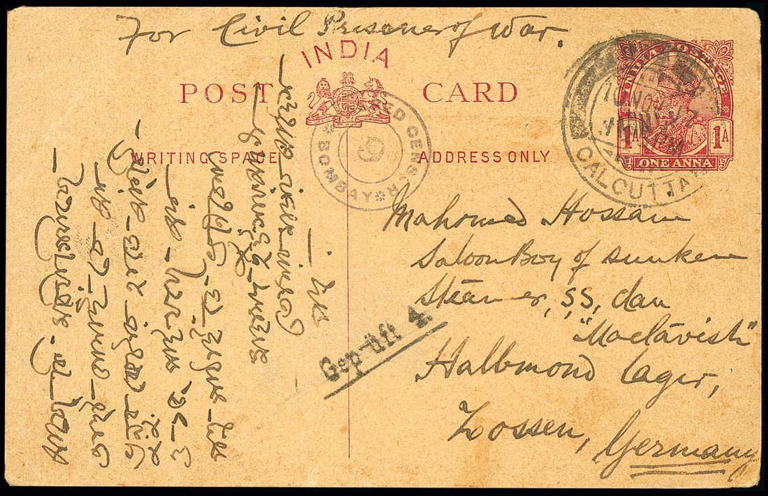 1917 (10 Nov.) India 1a. stationery card from Calcutta to "Mahomed Hossain, Saloon Boy of sunken Steamer, S.S. Clan Mactavish" POW in Zossen Camp, marked "For Civil Prisoner of War" and showing violet Bombay circular censor. Also a used picture postcard of the Captain, officers and crew of the S.S. "Möewe". Photo