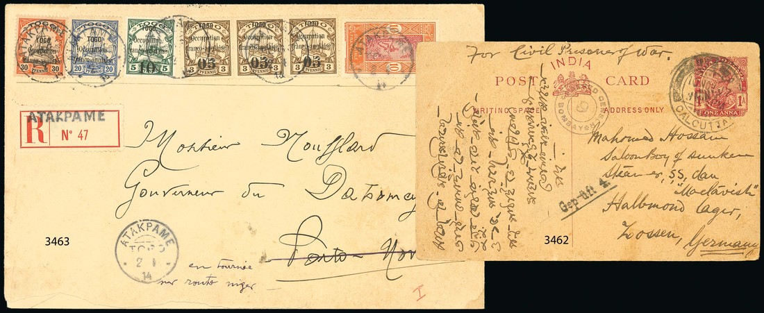 1914 (21 Dec.) envelope registered to the Governor of Dahomey whilst he was on an official visit to the River Niger, bearing 1914 (Oct.) "05" on 3pf. strip of three, "10" on 5pf., 20pf. and 30pf. in combination with Dahomey 1913 10c., all tied by "atakpame/togo" c.d.s., showing provisional registration label and, on reverse, Anecho (7.1), Grand Popo (8.1), Cotonou (10.1) and Save (12.1) datestamps. A rare and attractive franking. Photo