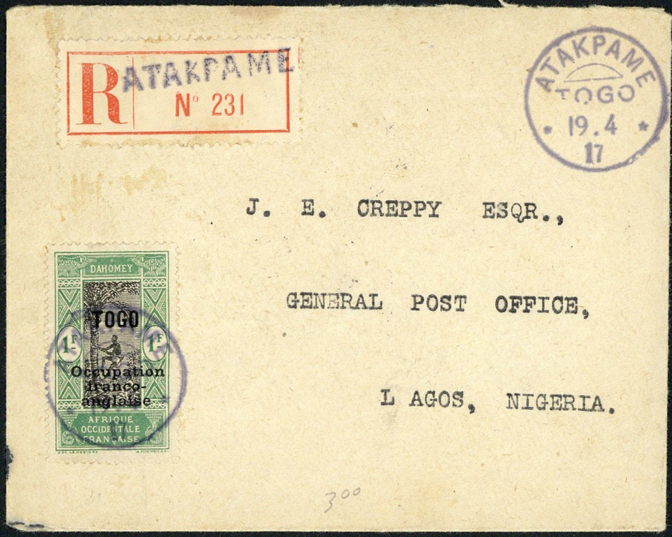 1917 (19 Apr.) envelope registered from Atakpame to Lagos, bearing 1916 on Dahomey 4f. tied by c.d.s. and showing provisional registration label with Lome and arrival datestamps on reverse