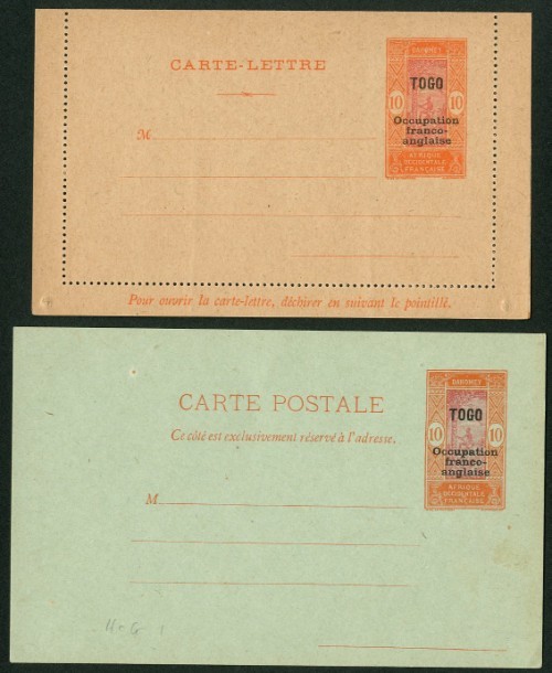 postal stationery: 1916 on Dahomey, 10c. postcard and 10c. letter card, both unused, fine. Scarce