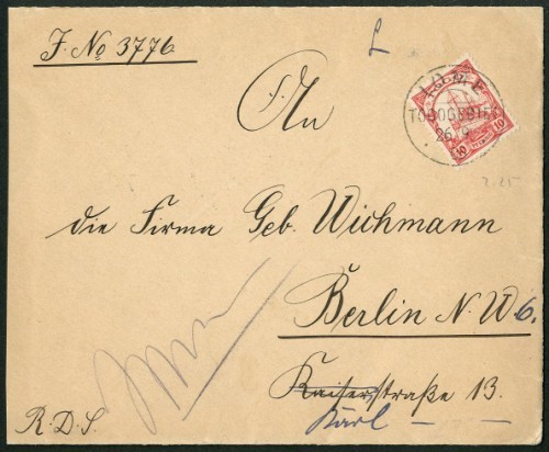1905 (26 Sept.) envelope to Berlin, bearing 10pf. tied by "lome/togogebiet" c.d.s. and showing, on reverse, "kaiserlicher gouverneur/von togo" wafer seal and arrival datestamp