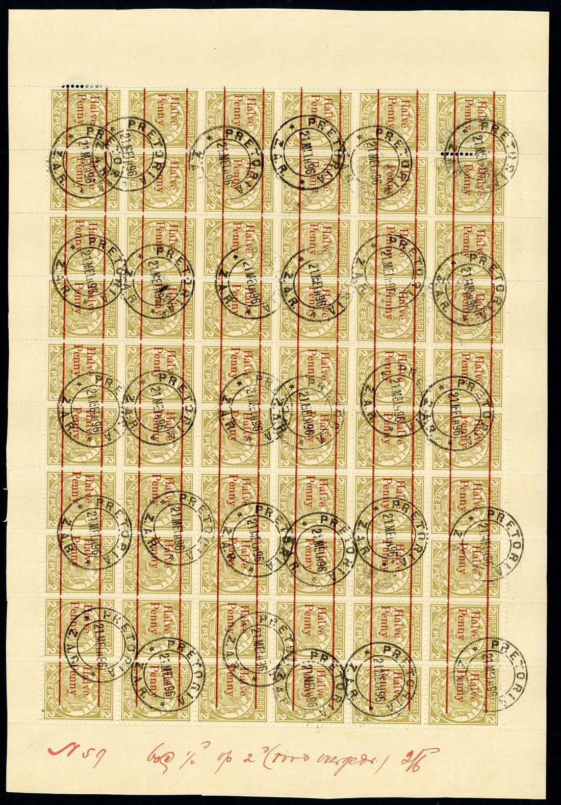 1893-1901 selection of complete sheets or larger multiples contained in two stockbooks, including 1893 ½d. on 2d. (5, three in red) and 2½d. Type 27, all cancelled-to-order, 1894 1d. mint blocks of 10 and 20 (3), 1895-96 1d. mint sheet, 3d. mint blocks of 30 and 40, 1895 1d. on 2d. mint (no top margin), 1895 6d. (2, one with overprints misplaced diagonally) cancelled-to-order 1896-97 2/6d. mint reprint sheet, 1901 ½d. on 2d. mint sheet; some with margins removed though a useful study group. Stated to cat. c. £2,500