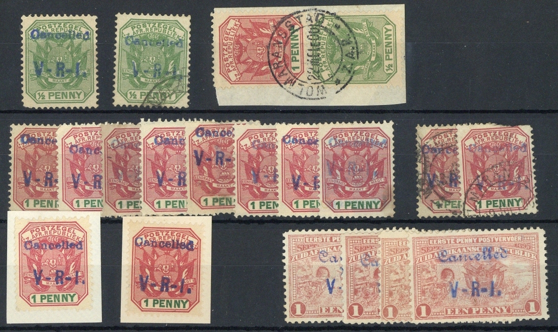 ½d. (2, one used), 1d. rose-red and green (14, two on pieces, two used) and 1d. red (4), unused, some with gum; condition mixed. Also Transvaal ½d. and 1d. on piece sharing double-ring datestamp. S.G. 1, 2, 9