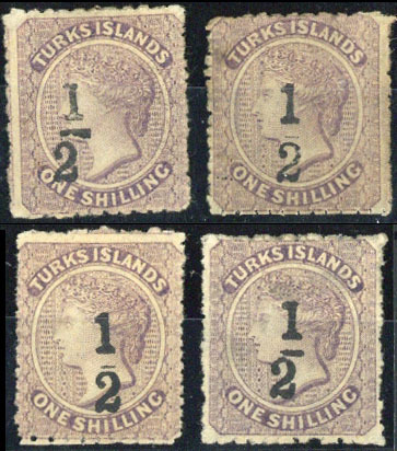 Settings 4-7, "½" Types 5 (2, one with short thick bar), 5 and 6 on 1/- lilac, unused with part gum; Types 4 variety and 6 with thins not affecting appearance. S.G. 12-14, 12b, £1,135