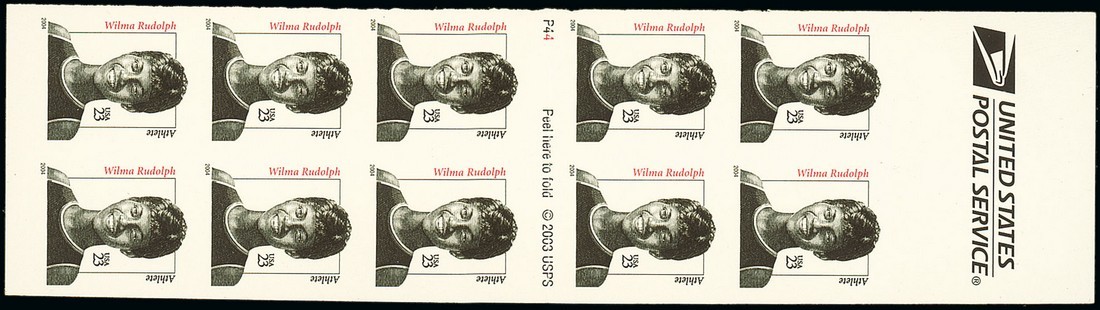 2004 "Wilma Rudolph" 23c. black and red, booklet of ten stamps, variety all die cutting omitted. Sismondo Certificate (2012). Scott 3436d. Photo
