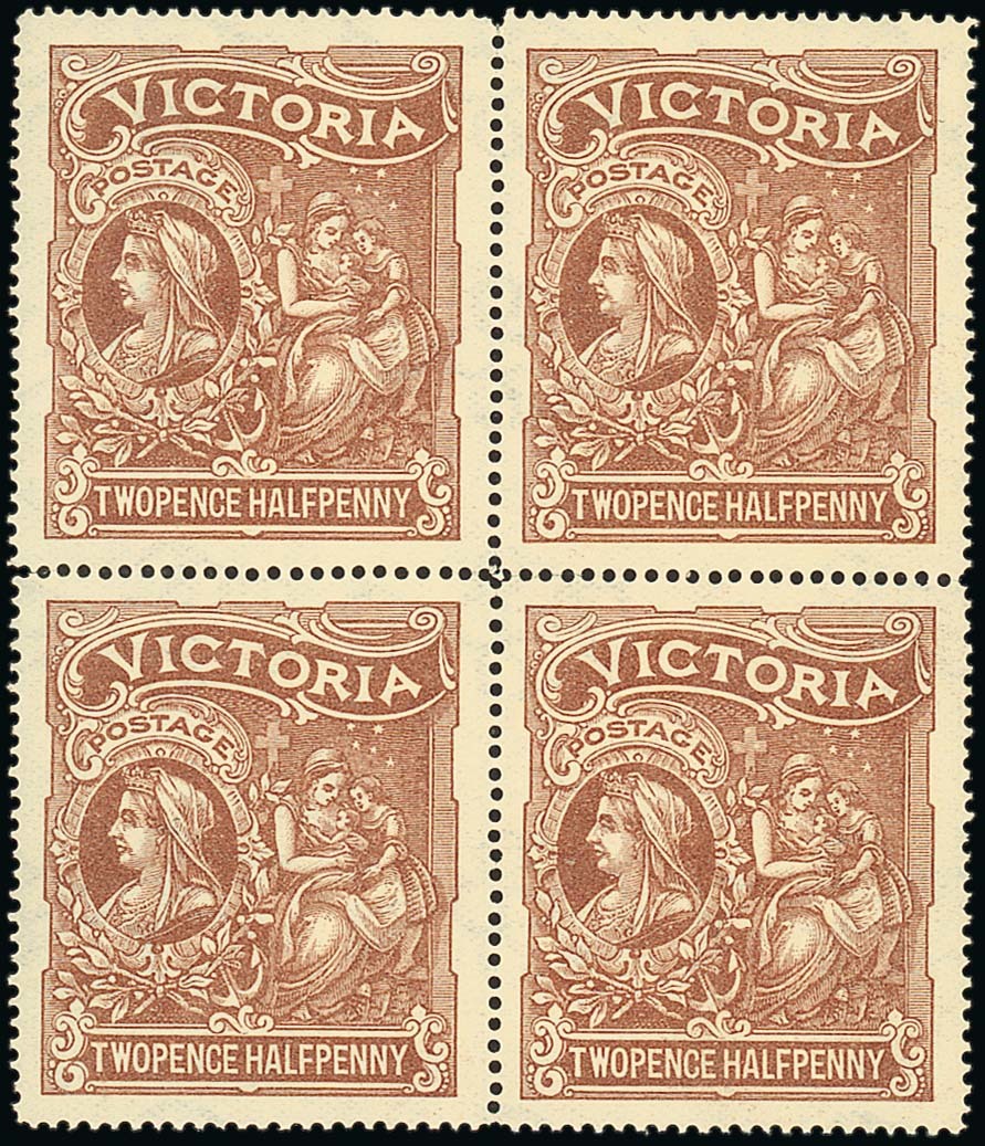 1897 (Oct.) Hospital Charity Fund 1d. (1s.) and 2½d. (2s.6d.) in unmounted mint blocks of four, the 1d. from the lower left corner, fresh and fine. Very scarce. S.G. 353-354. Photo for 2½d.