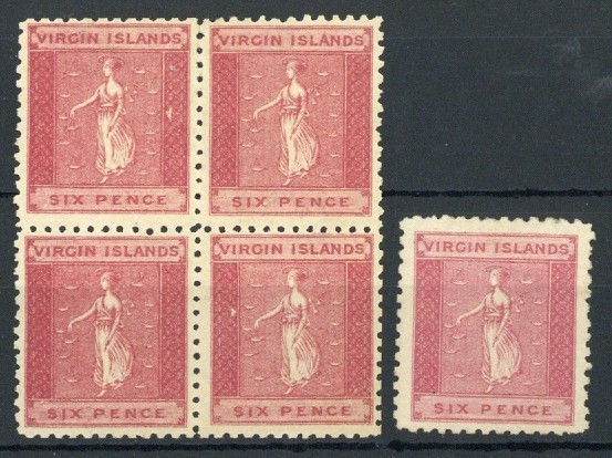 6d. deep rose block of four (lower row with part papermaker's watermark) and single unused with part and small part original gum respectively, fine. S.G. 4, £650