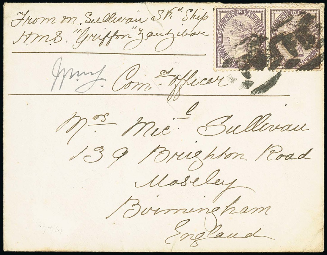 1889 sailor's envelope ex the Sullivan correspondence from "H.M.S. Griffon, Zanzibar" to England, bearing 1881 1d. lilac (2) both cancelled "fb" (Foreign Branch in bars, Birmingham arrival c.d.s. (22.4) on reverse; an attractive cover from one of a fleet of navy ships participating in the naval blockade of the East African mainland. Photo