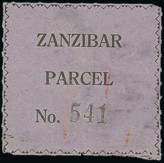 1930-33 (c.) black on mauve label inscribed "zanzibar/parcel/no. 541", rouletted with borders similar to the issued Postage Due design; small peripheral faults and red crayon marks. A most unusual item which we have not seen before. Photo