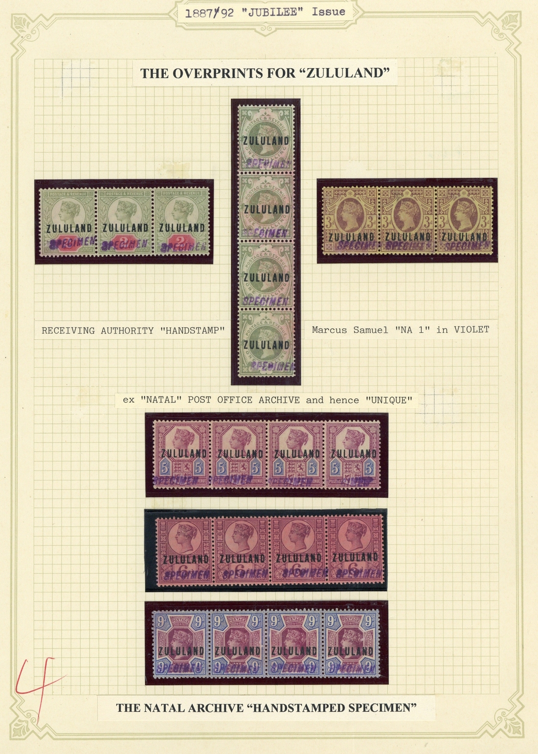 1888-93, mint and used selection (49), including ½d. to 5/- (except 1d.) overprinted "specimen", 2d. and 3d.. strips of three, 5d., 6d., 9d. and 1/- horizontal or vertical strips of four overprinted "specimen" without gum ex the Natal Post office archive. Also Fiscal 1d. overprinted "specimen", etc., mixed condition