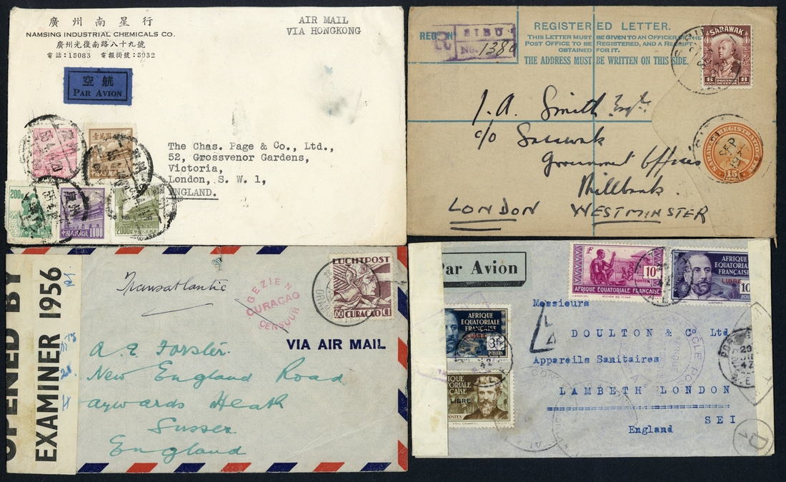 An All world Postal History selection of mostly 1930's/40's commercial envelopes, contained in a shirt box, including airmail, censored, registered with 1937 Sararwak 15c. orange envelope, uprated with 8c., from Sibu. An interesting lot. (hundreds)