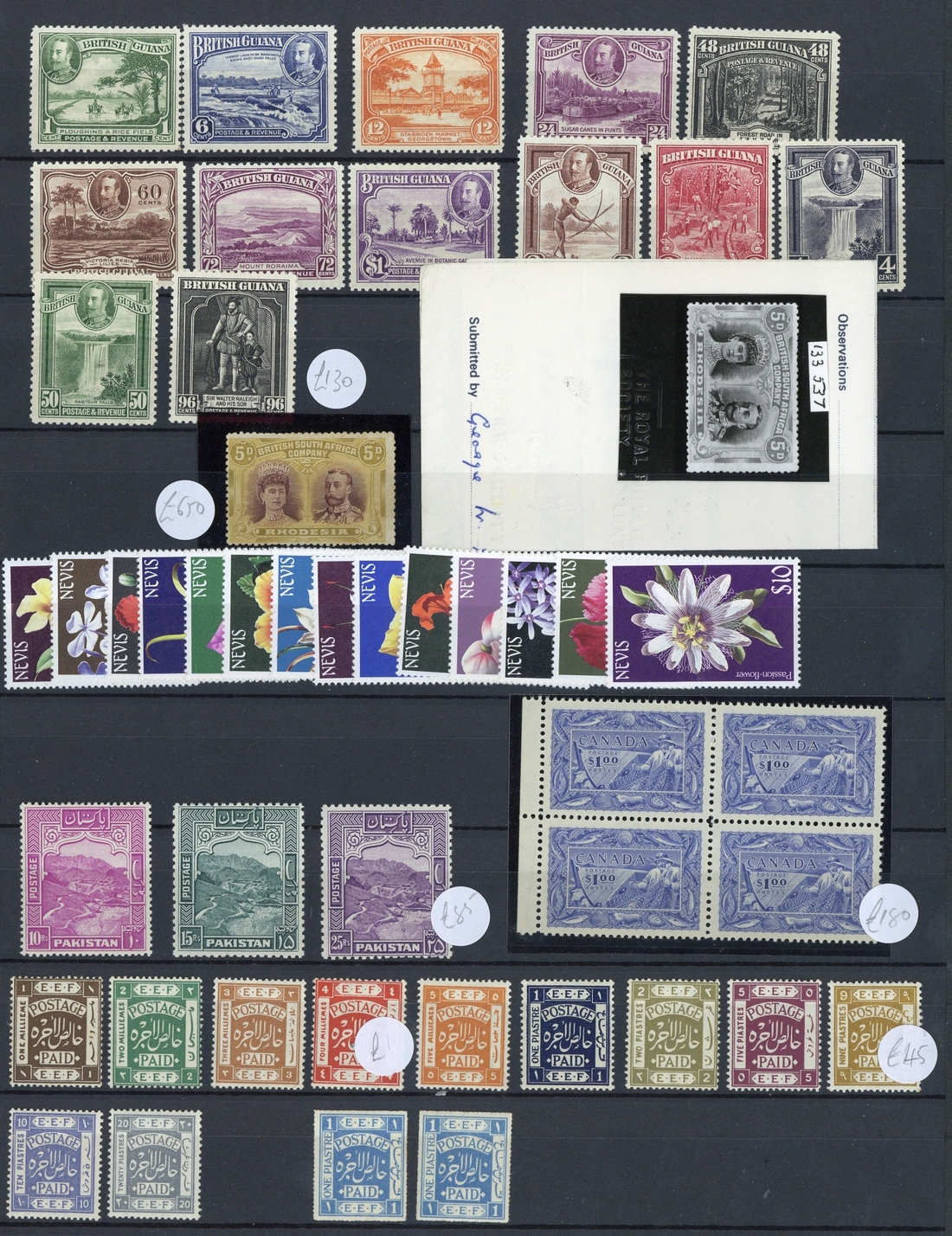 British Empire mint selection (227) on stockpages, including British Guiana 1934-51 set, Canada 1951 Fisherman $1 block of four, Nauru 1916-23 ½d. to 1/-, New Guinea 1939 Air £1 (2), North Borneo 1961 set, Postage Due 1895-97 12c. and 18c. blocks of four, Rhodesia 1910-13 5d. purple-brown and ochre error of colour, stained (R.P.S. Certificate 1985), etc., chiefly good to fine