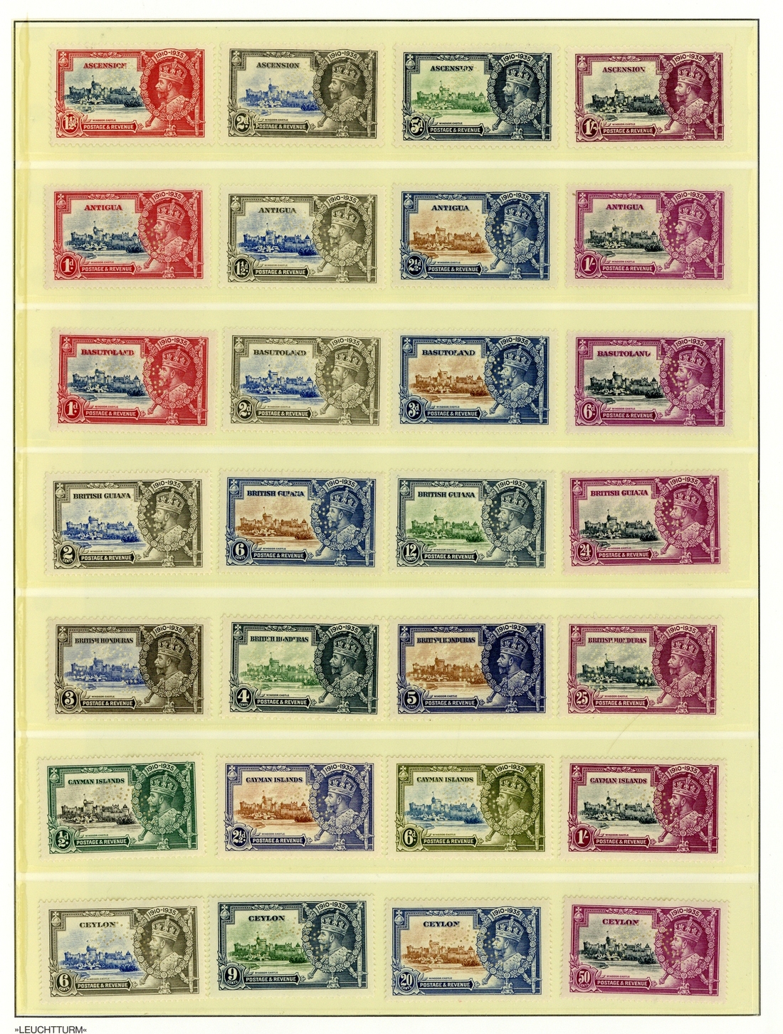 1935 Silver Jubilee sets perforated "specimen" comprising, Antigua, Ascension, Basutoland, British Guiana, British Honduras, Cayman Islands, Ceylon, Dominica, Gambia, Gilbert and Ellice Is., Gold Coast, Grenada, Kenya, Uganda and Tanganyika, Leeward Is., Montserrat, Newfoundland, Nigeria, St. Helena, St. Lucia, St. Vincent, Seychelles, Sierra Leone, Somaliland, Straits Settlements, Trinidad and Tobago, Turks and Caicos Is. and Virgin Is., many with hinge remnants otherwise generally fine. Cat. £3,985