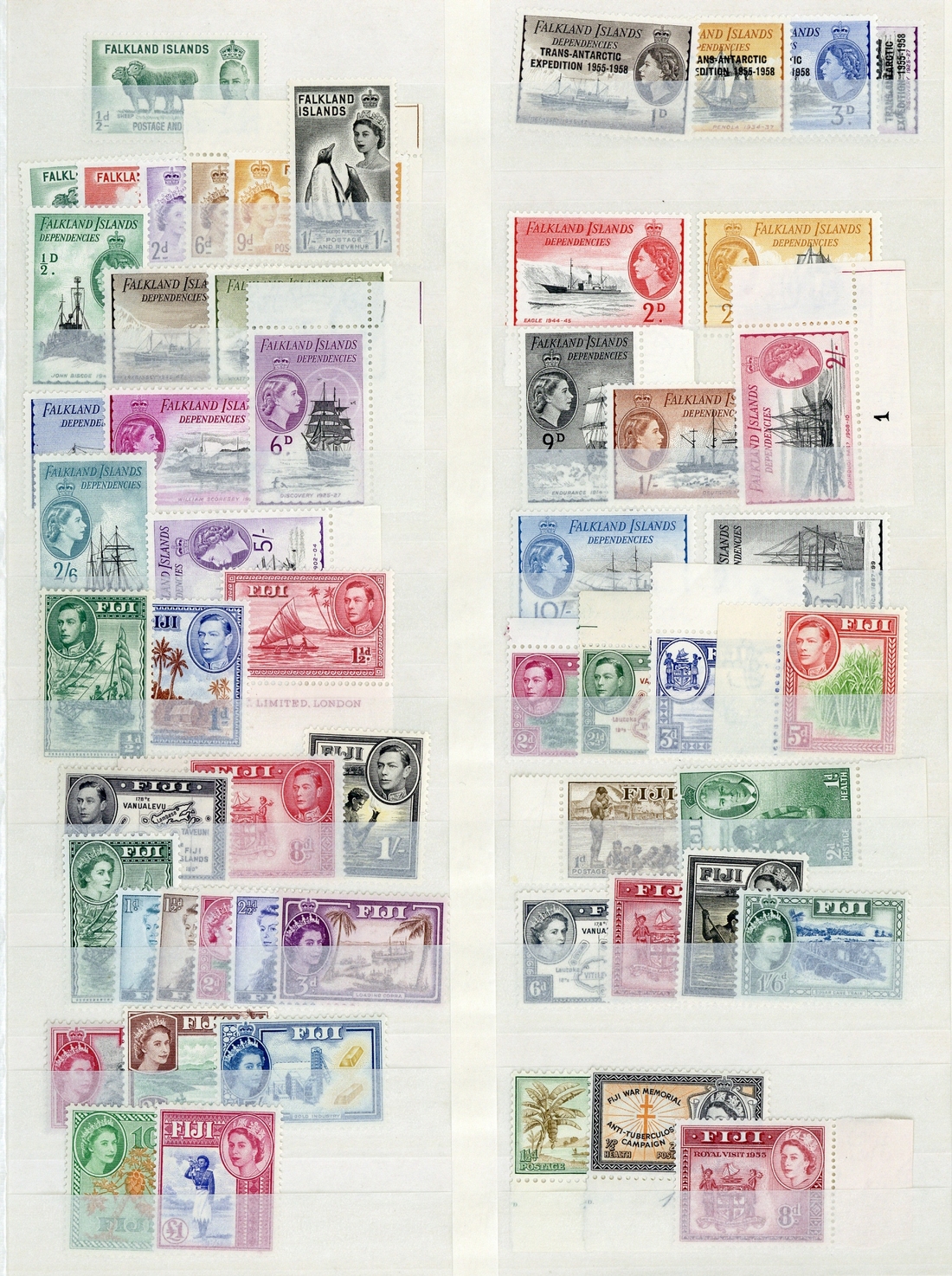 British Empire K.G.V to Q.E.II predominately unmounted mint collection arranged in a stockbook with many complete Definitive sets including Antigua 1953-62 to $4.80, Ascension 1956 to 10s., Bahamas 1954-63 to £1, Basutoland 1954-58 to 10/-, Bechuanaland 1955-58 to 10/-, Bermuda 1953-62 to £1, British Guiana 1954-63 to $4.80, British Honduras 1953-62 to $5, British Virgin Islands 1956-62 to $4.80, Cyprus 1955-60 to £1, Dominica 1954-62 to $2.40, Falkland Islands 1954-62 Ships to £1, Fiji 1954-59 to £1, Gambia 1953-59 to £1, Gibraltar 1953-59 to £1, Hong Kong 1954-62 to $10, K.U.T. 1954-59 to £1, Malta 1956-58 to £1, New Zealand 1953-59 to 10/-, Papua New Guinea 1952-58 to £1, Southern Rhodesia 1937 to 5/-, 1953 to £1, Rhodesia and Nyasaland 1954-56 to £1, St. Helena 1953-59 to 10/-, Sarawak 1955-59 to $5, Seychelles 1954-61 to $5, Singapore 1955-59 to $5, Somaliland 1953-58 to 10/-, Swaziland 1956 to £1, Tristan da Cunha 1954 to 10/-. Generally fine to very fine